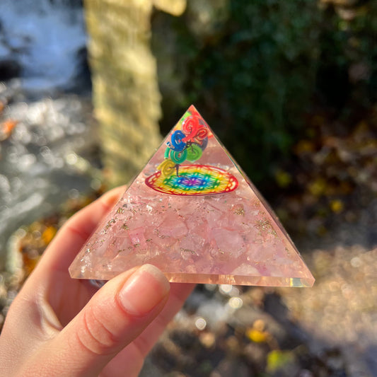Orgonite Pyramid - Rose Quartz Rainbow Flower of Life