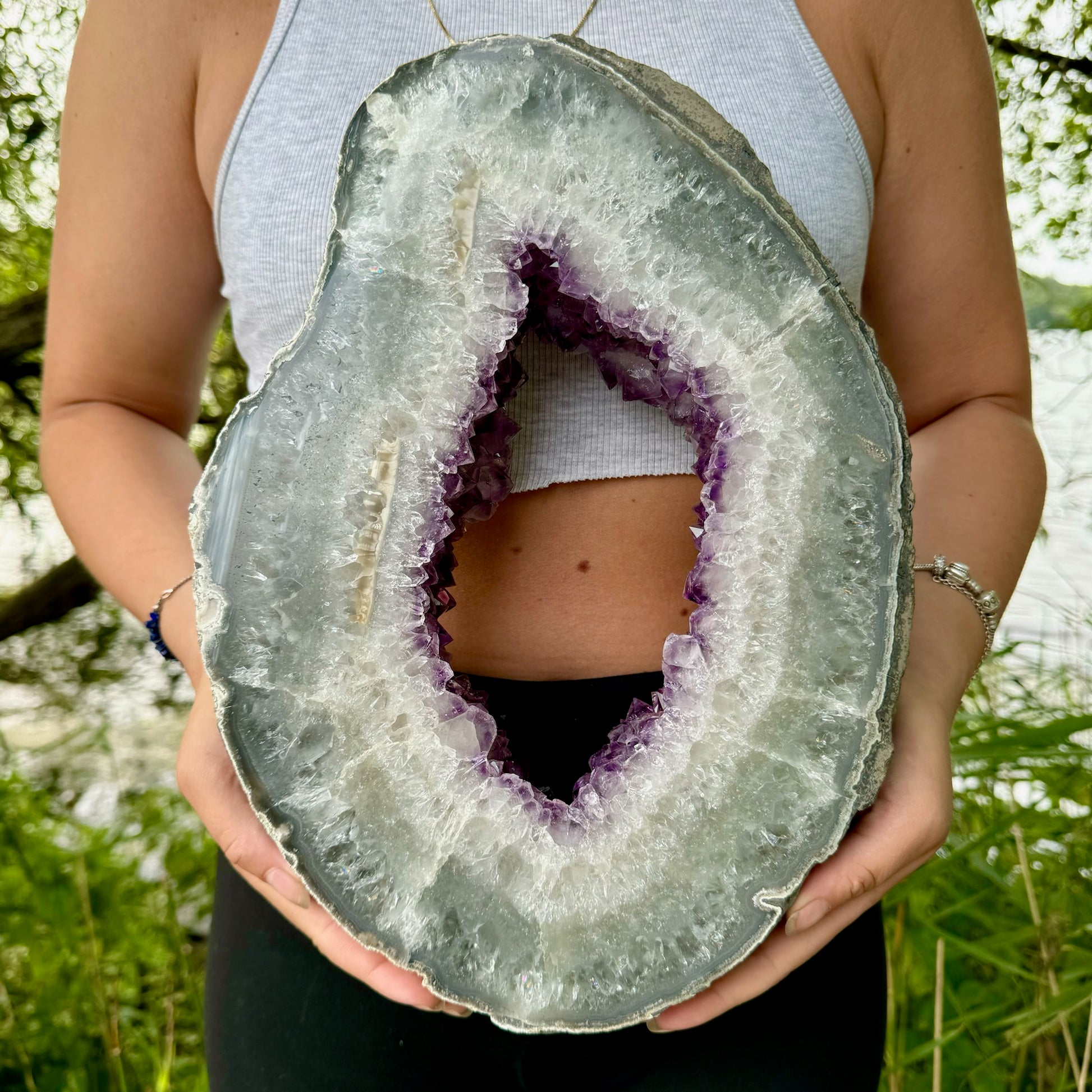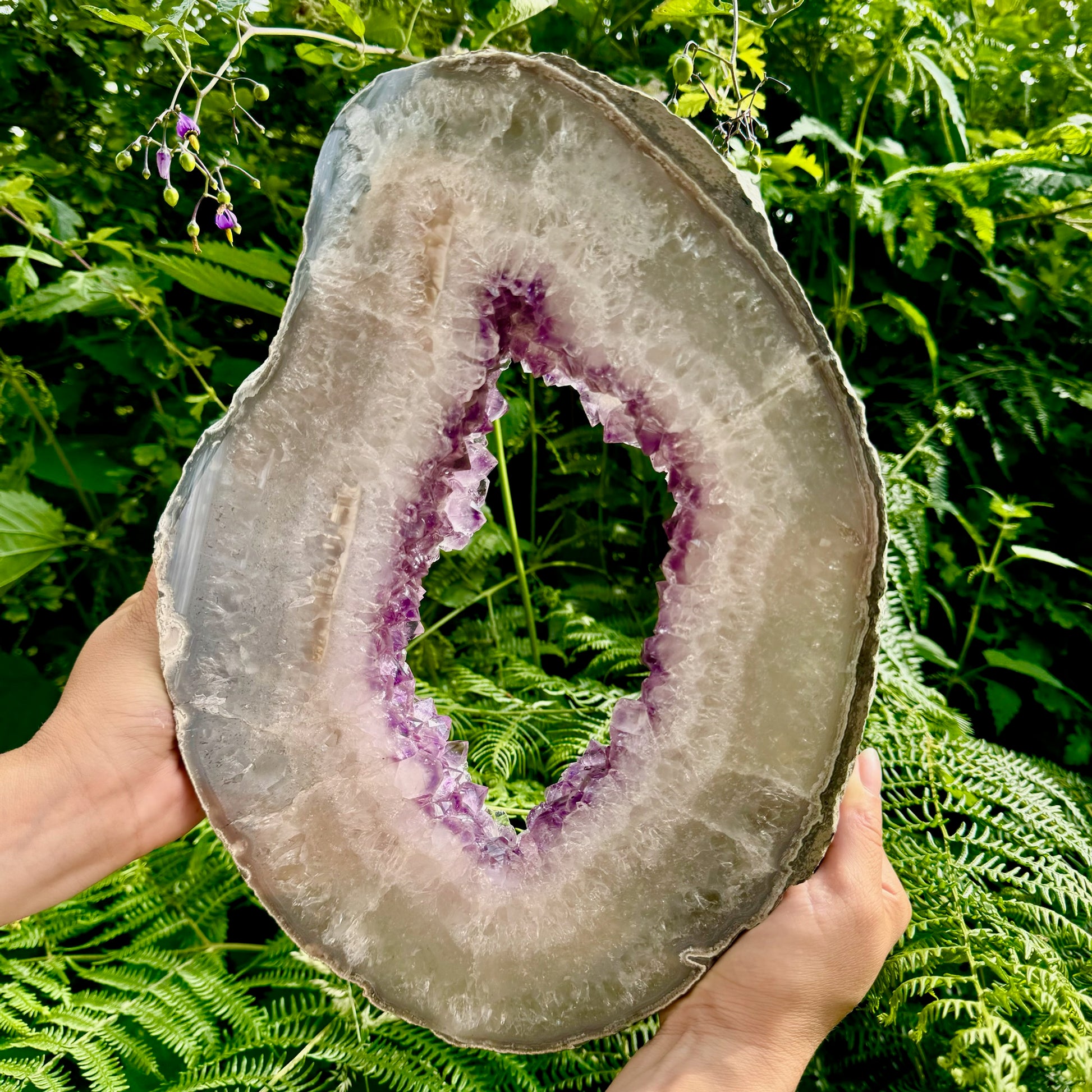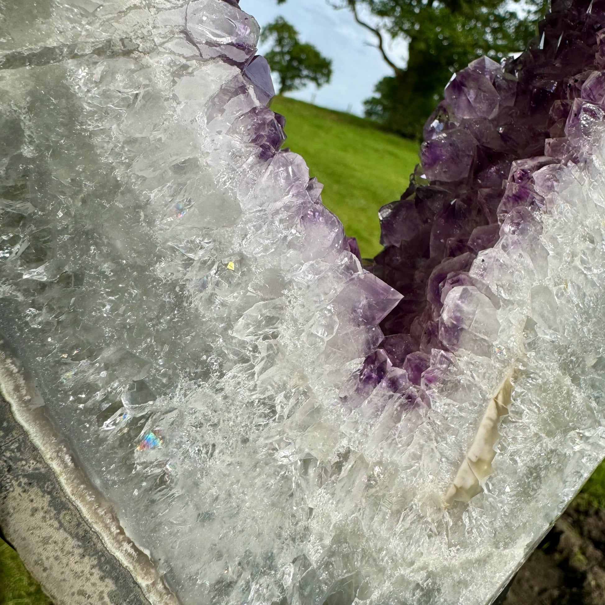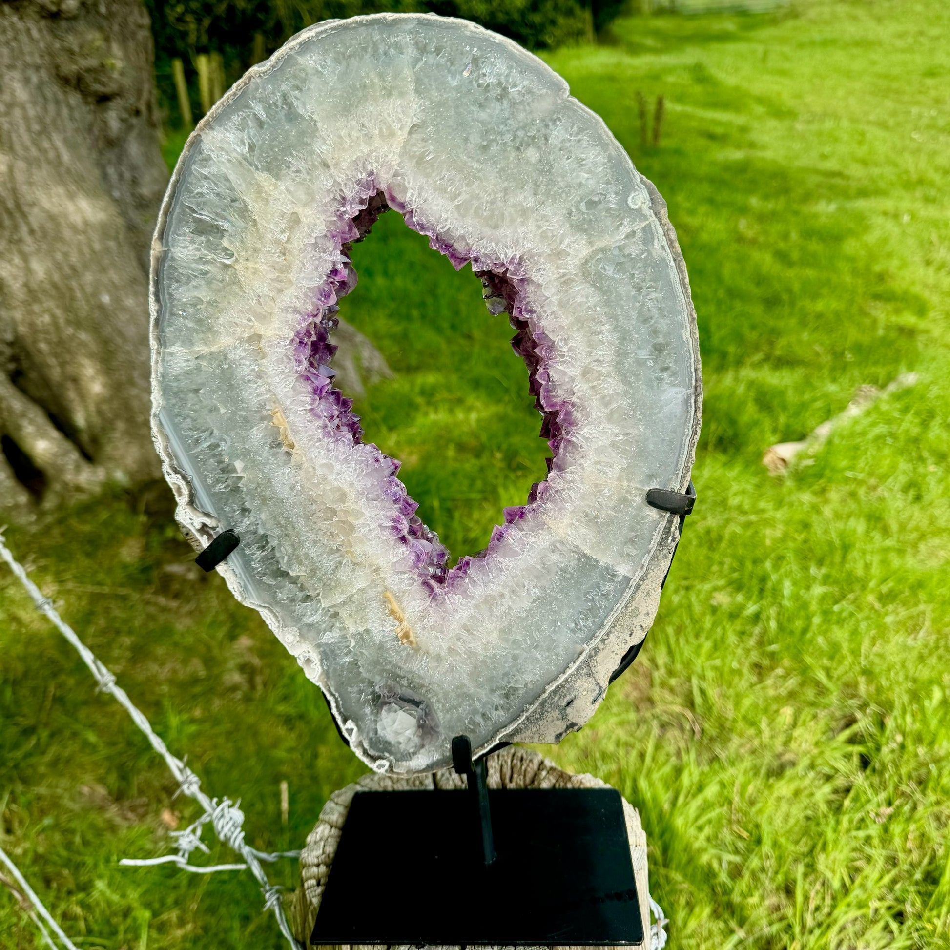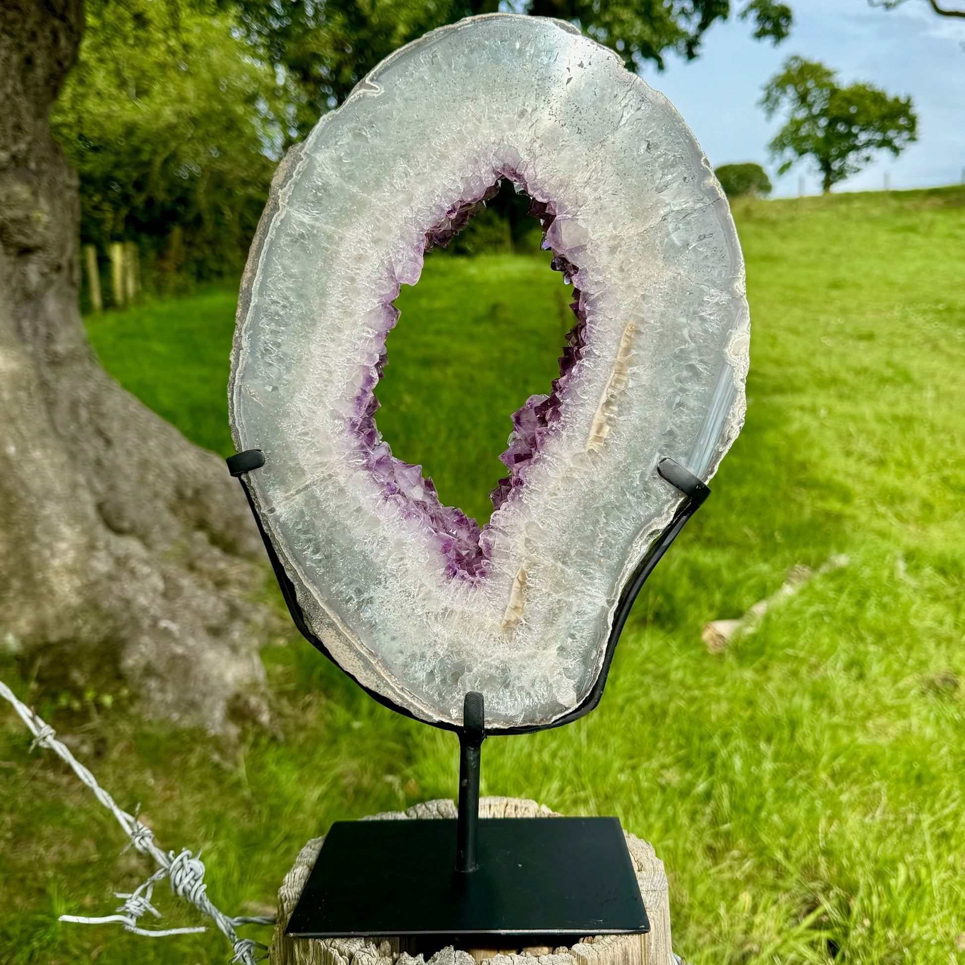 Stunning ‘One of a Kind’ polished Amethyst slice with the most beautiful dark hues of purple clusters with rainbows. Displayed on a steel stand for an eye catching stand out piece anywhere in your home, office, shop or space. Bring relaxing, peaceful energy with the properties of Amethyst.