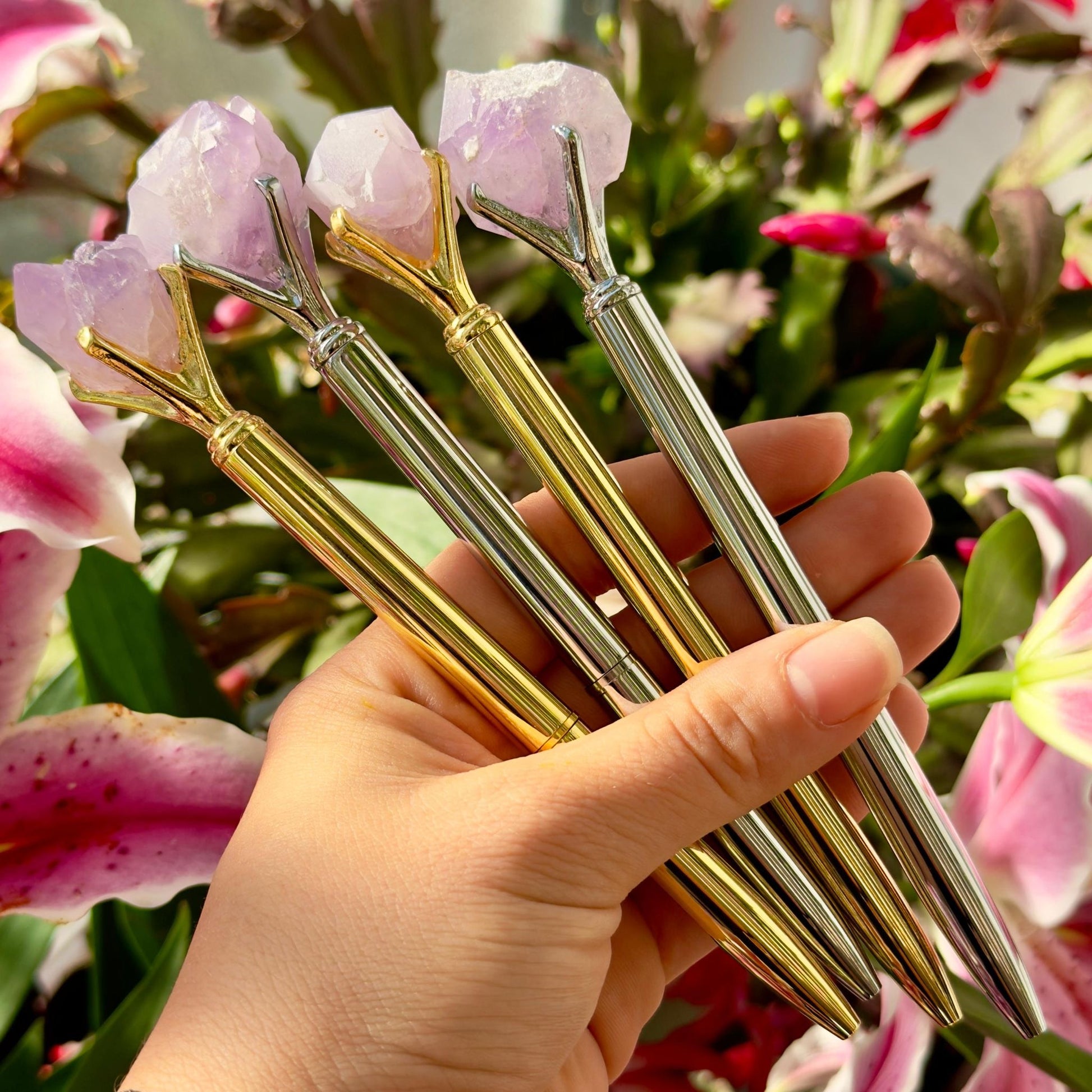 Write with intention using this beautiful amethyst crystal pen. A raw amethyst stone sits nestled in a claw-like setting at the top, bringing natural elegance to your everyday moments. Available in silver or gold finishes, this pen combines functionality with the calming energy of genuine crystal. Perfect for mindful writing and a meaningful companion throughout your day.