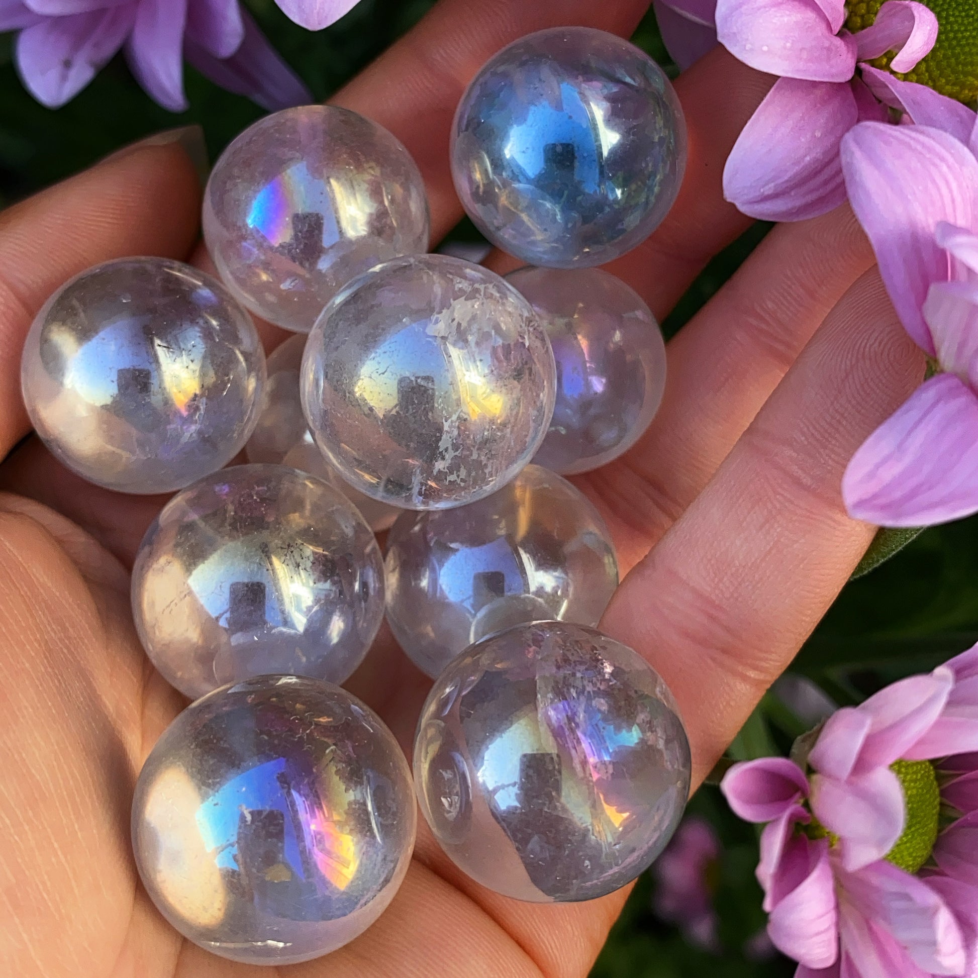 These wonderful Aura Clear Quartz Spheres are the perfect everyday carry Crystal for beginners & Crystal collectors making them the best unique gift idea for anyone you care about including yourself!
