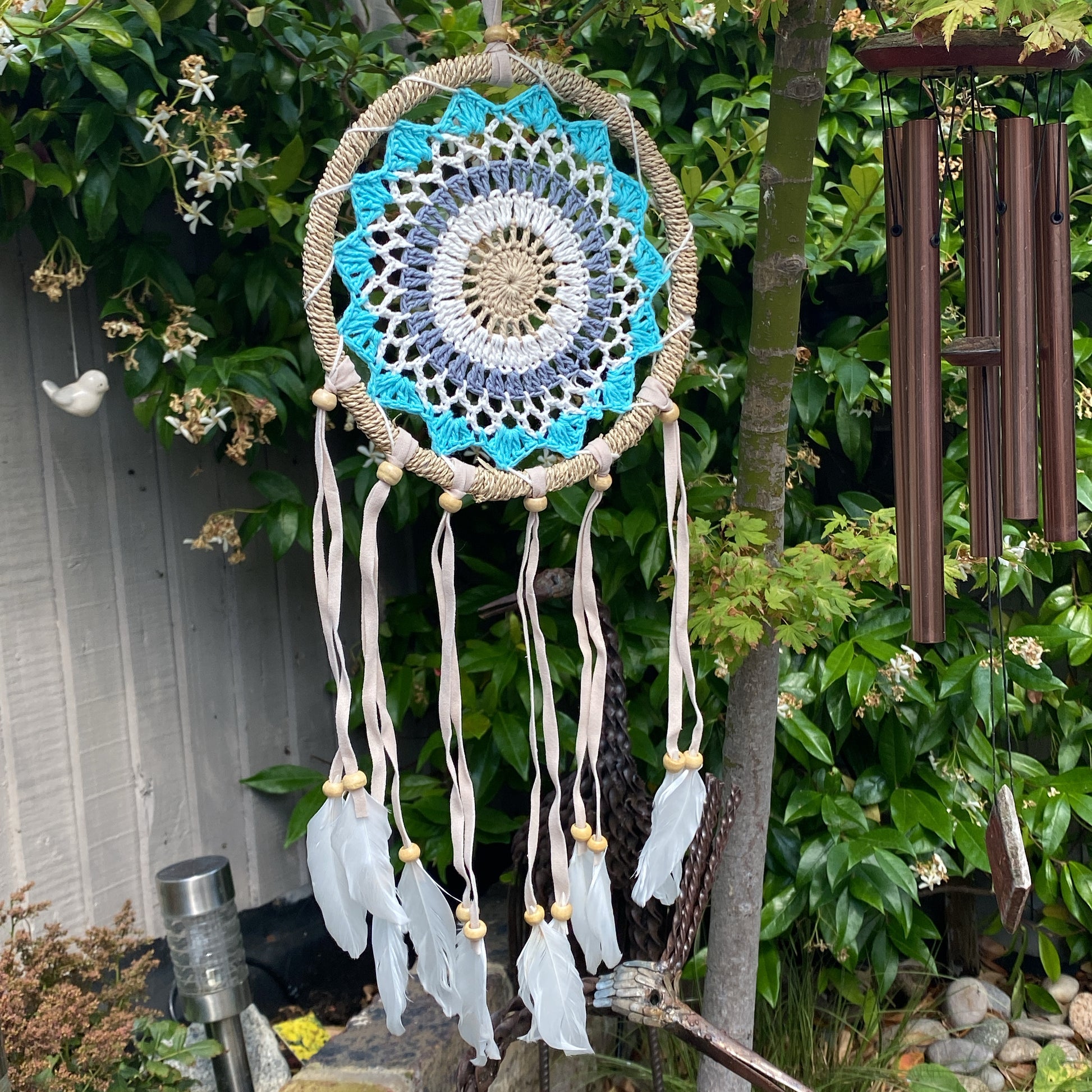 Native Americans believe that the night brings good and bad dreams. The dreamcatcher when hung near your bed catches the dreams. The good pass through and the bad not knowing the way get tangled in the dreamcatcher and perish with the first light of dawn. Sweet Dreams!