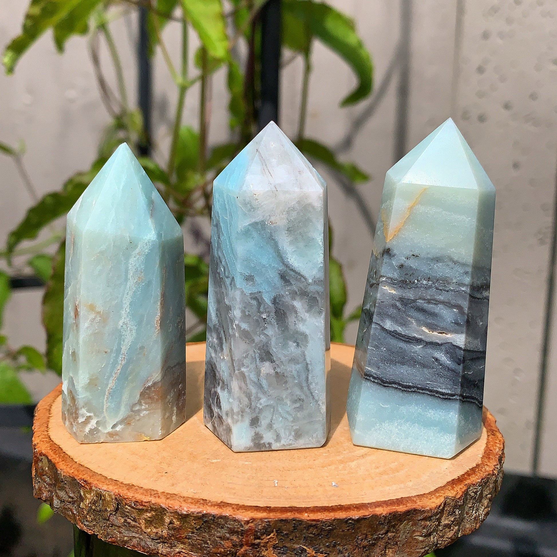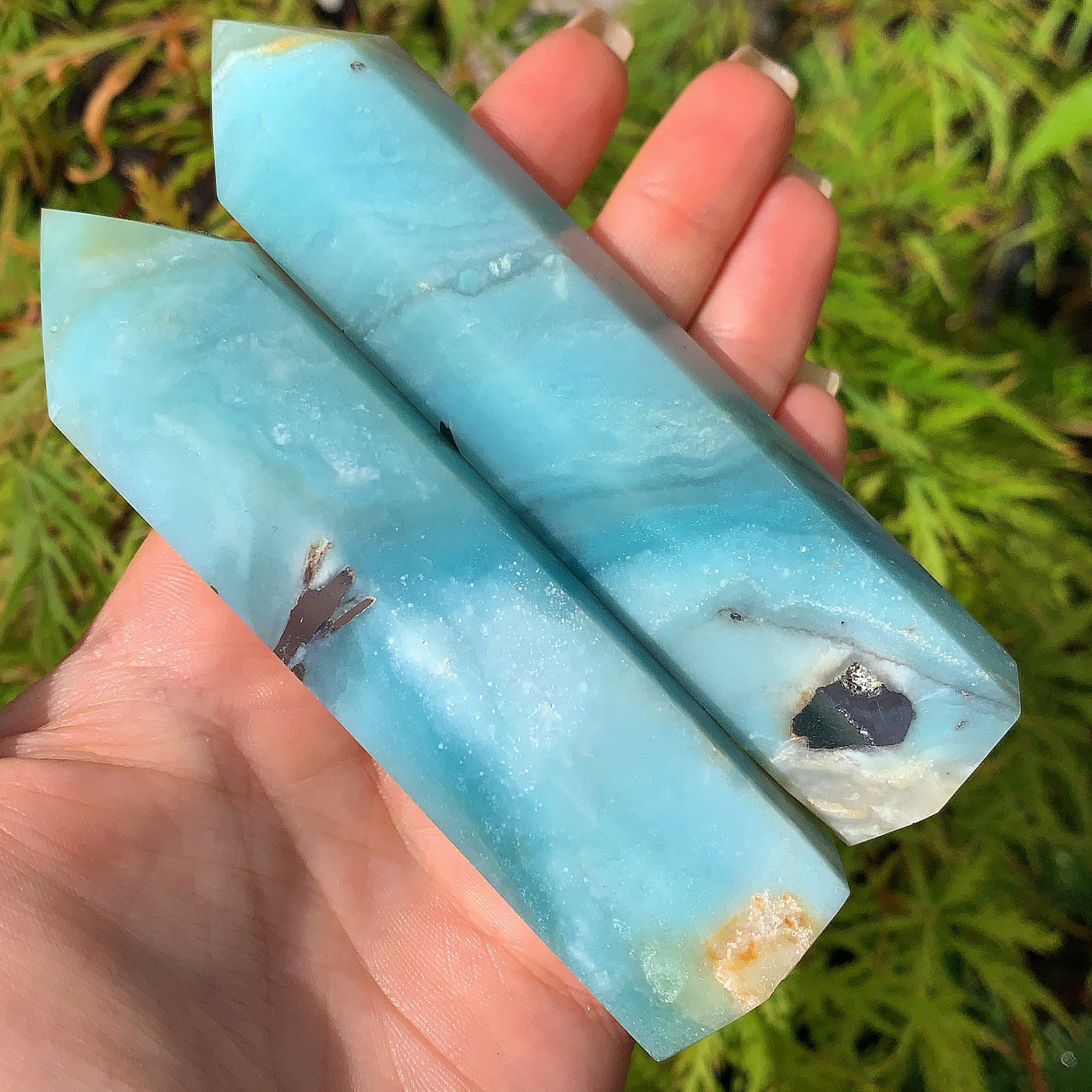 These beautiful Caribbean Calcite Points have the most stunning ocean blue Calcite colouring and light brown and white colouring from the Aragonite. The colours in Caribbean Calcite resemble the scenes of a dreamy beach and ocean. Points can be used in combination with other crystals to create an energy grid, opening and aligning whilst clearing the aura bodies and opening energy blocks whilst harnessing positive energy. A single crystal point pointed away from the body draws energy off, and pointed inwards draws energy in.