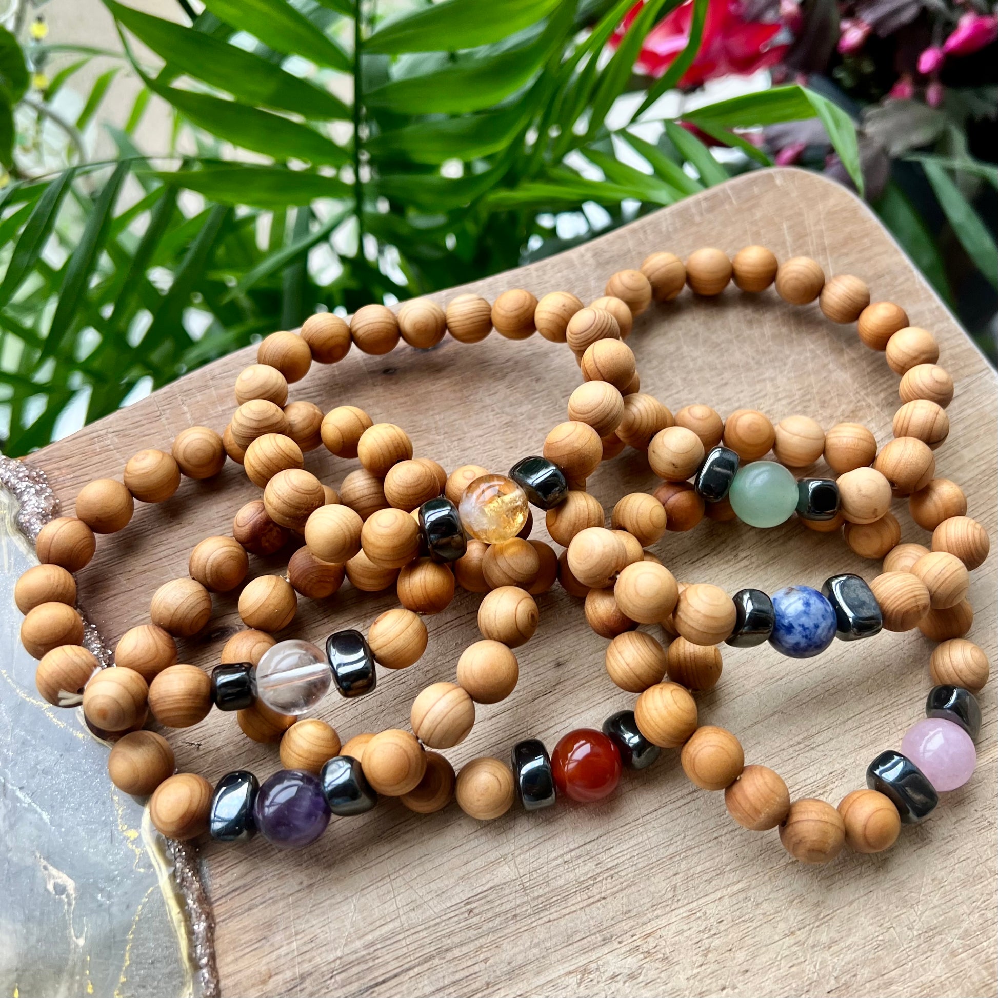 Embrace natural energy with our Cedarwood Crystal Bracelet, thoughtfully crafted to support your wellbeing journey. Each unique bracelet features aromatic cedarwood beads paired with grounding hematite and a carefully selected crystal types.