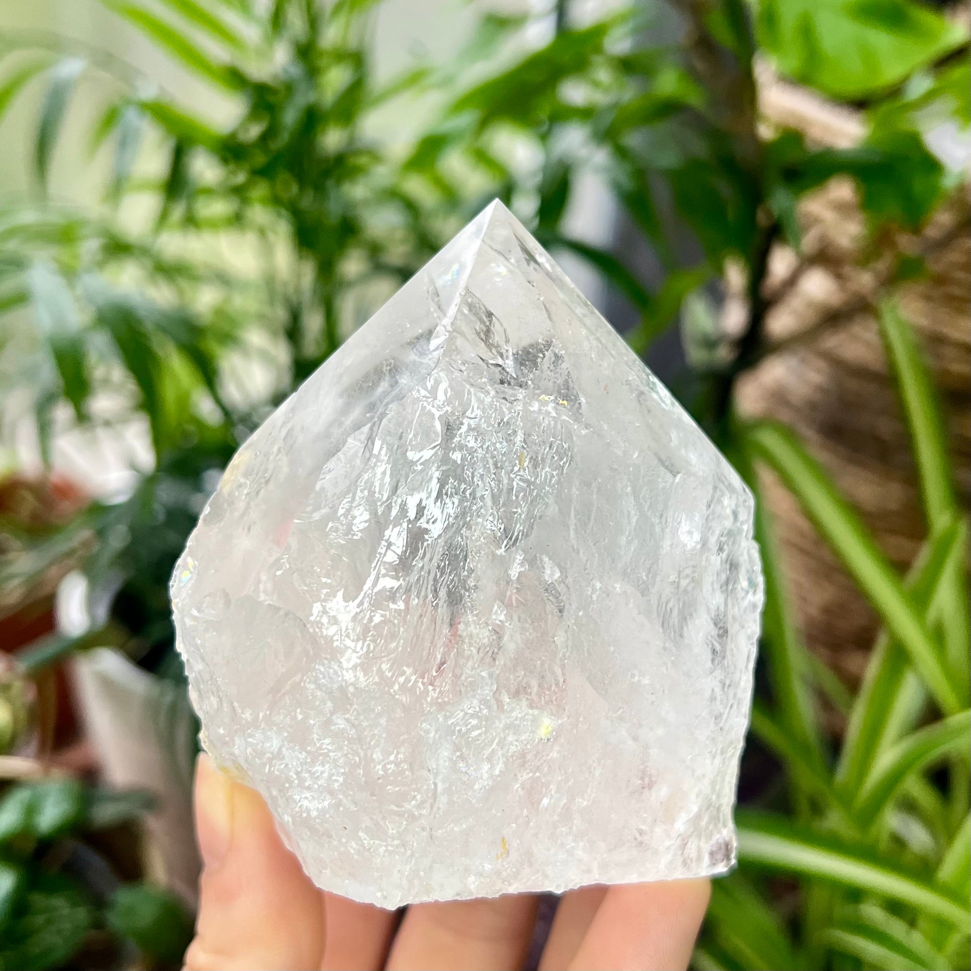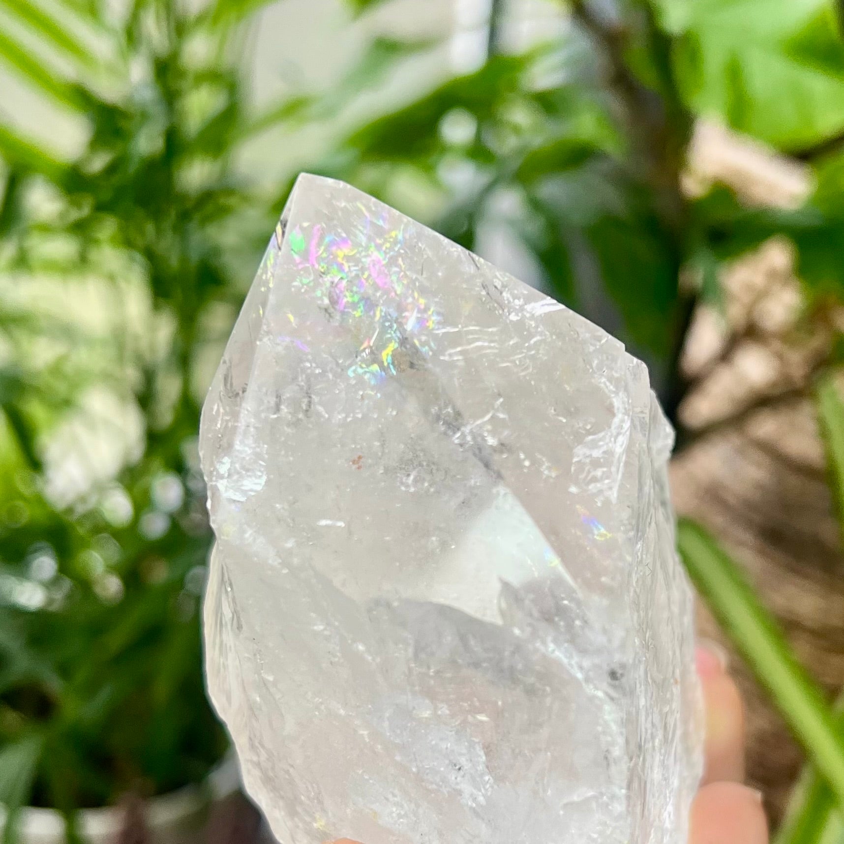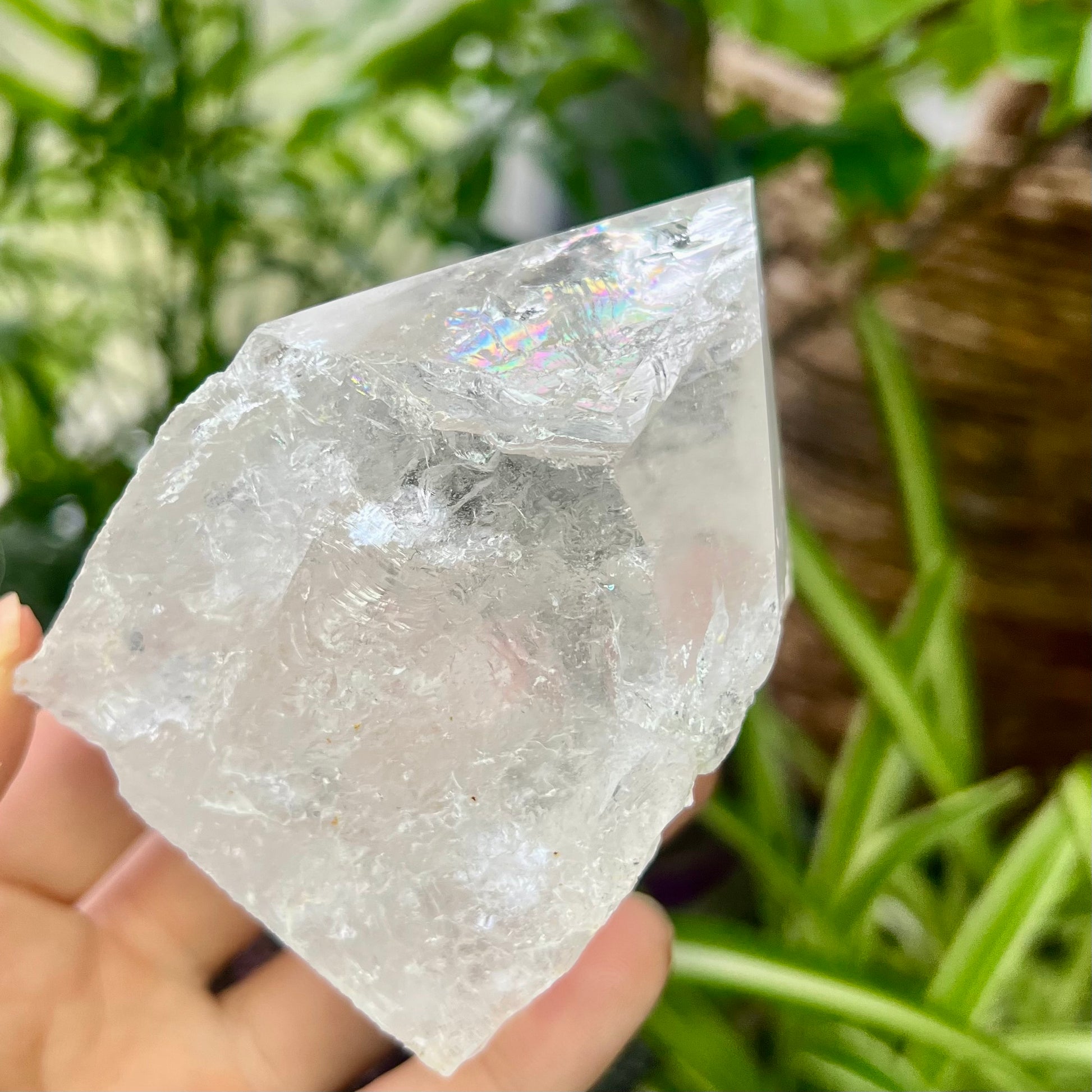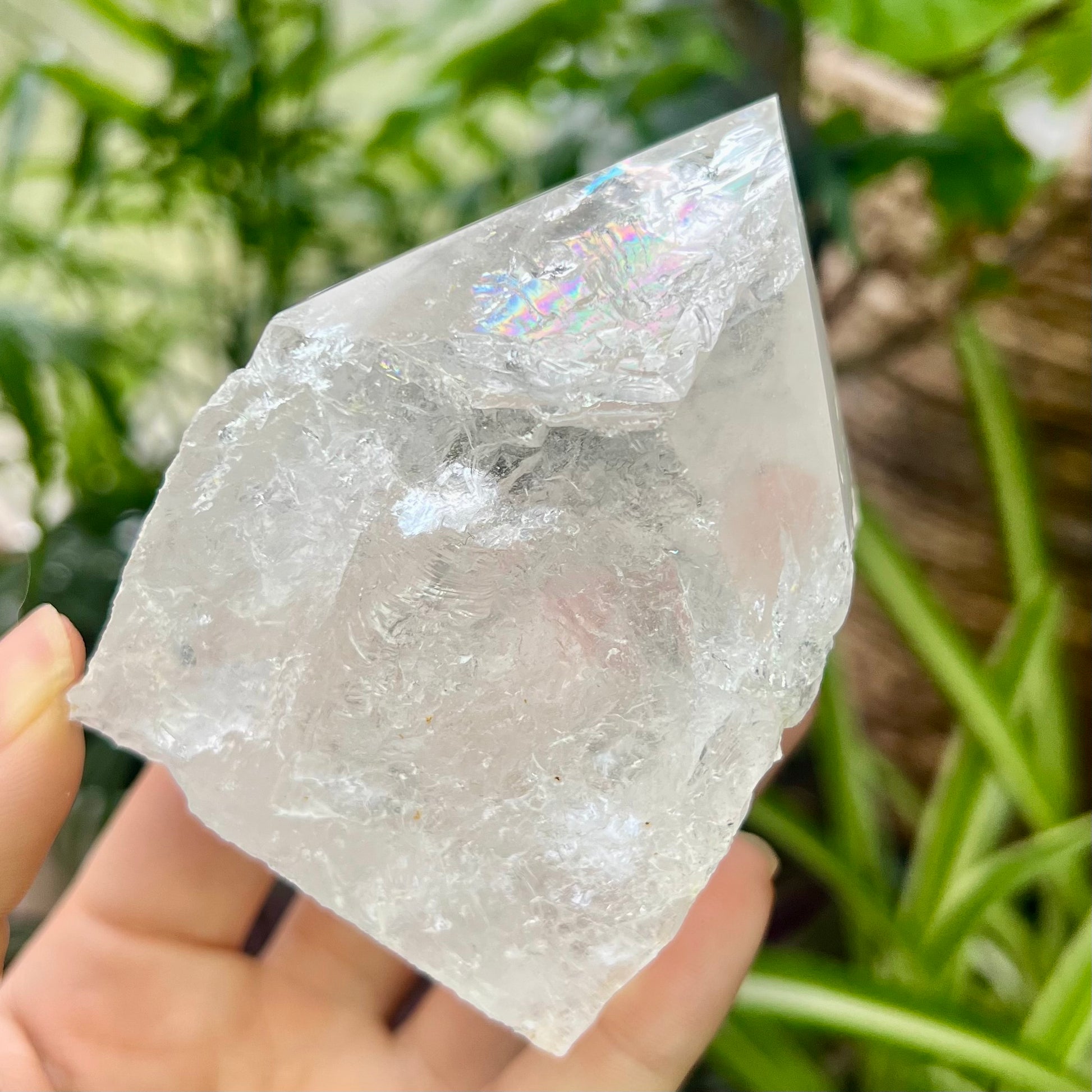 Upgrade your crystal collection with our Clear Quartz Rainbow Point. This high-grade 304g point boasts a stunning rainbow formation and expertly cut base. Connect with positive energy and enhance clarity of mind with this beautiful addition to your home.