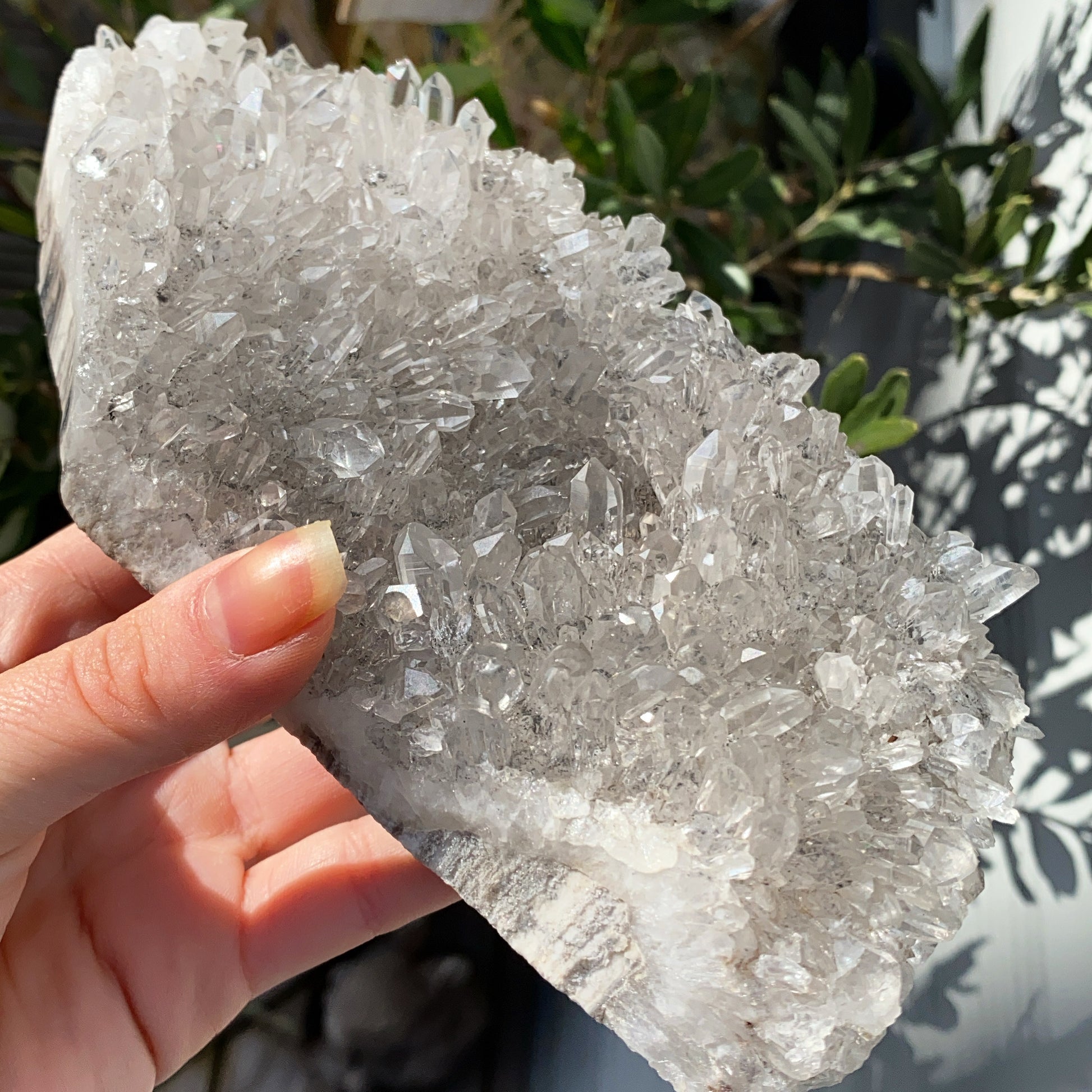 This high grade clear quartz cluster is a beautiful example of how crystal clear quartz can be with striking clear quartz shard formations. An absolute must have for any serious crystal collector or a premium high quality crystal for beginners!