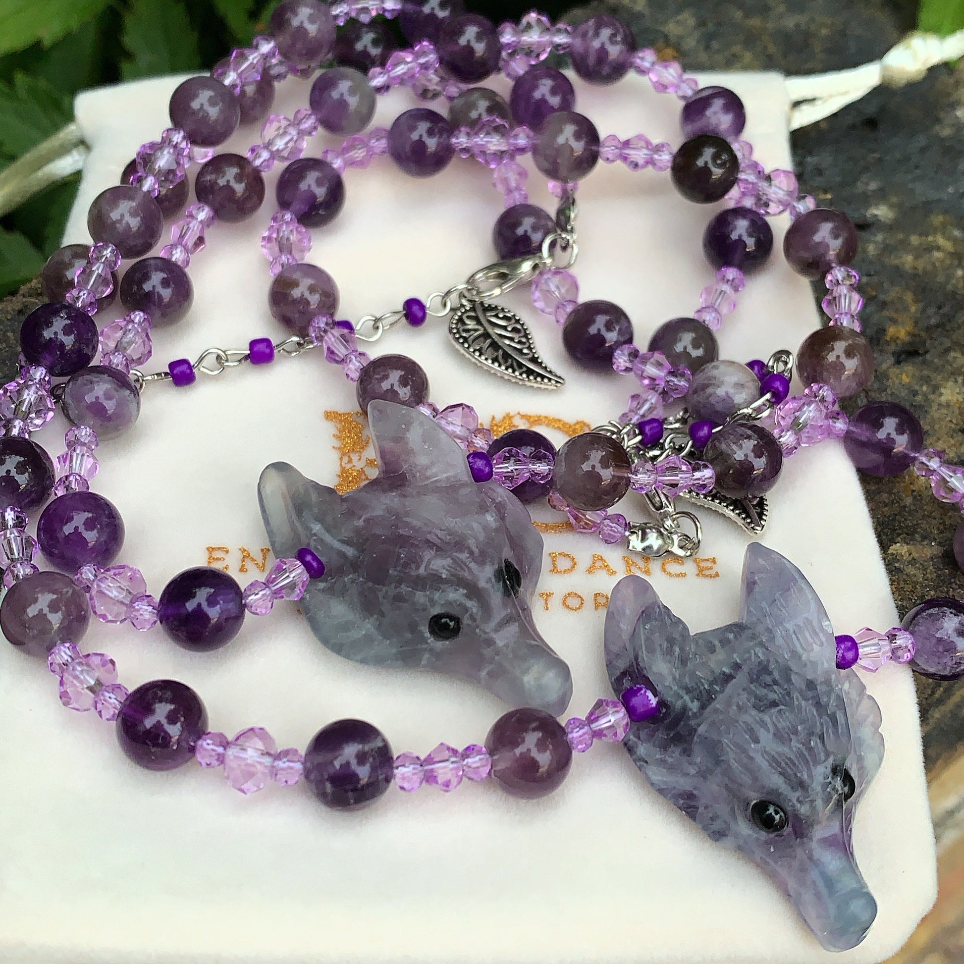 Natural Fluorite & Amethyst Wolf Necklace by Endless Guidance