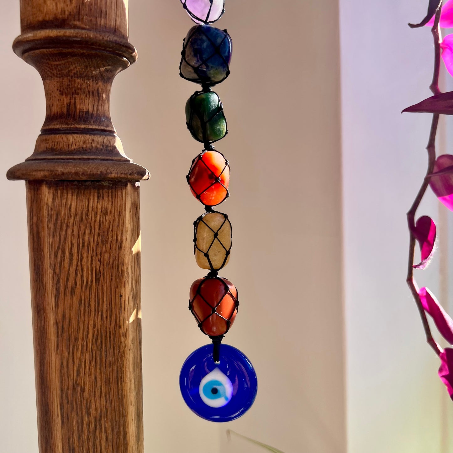Elevate the energy in your home with our Hanging Chakra Stone Pendant. This pendant features seven different types of crystals that are carefully aligned to promote balance and ward off negative energy. Hang it anywhere in your living space to experience the potential benefits of a harmonious and positive environment.