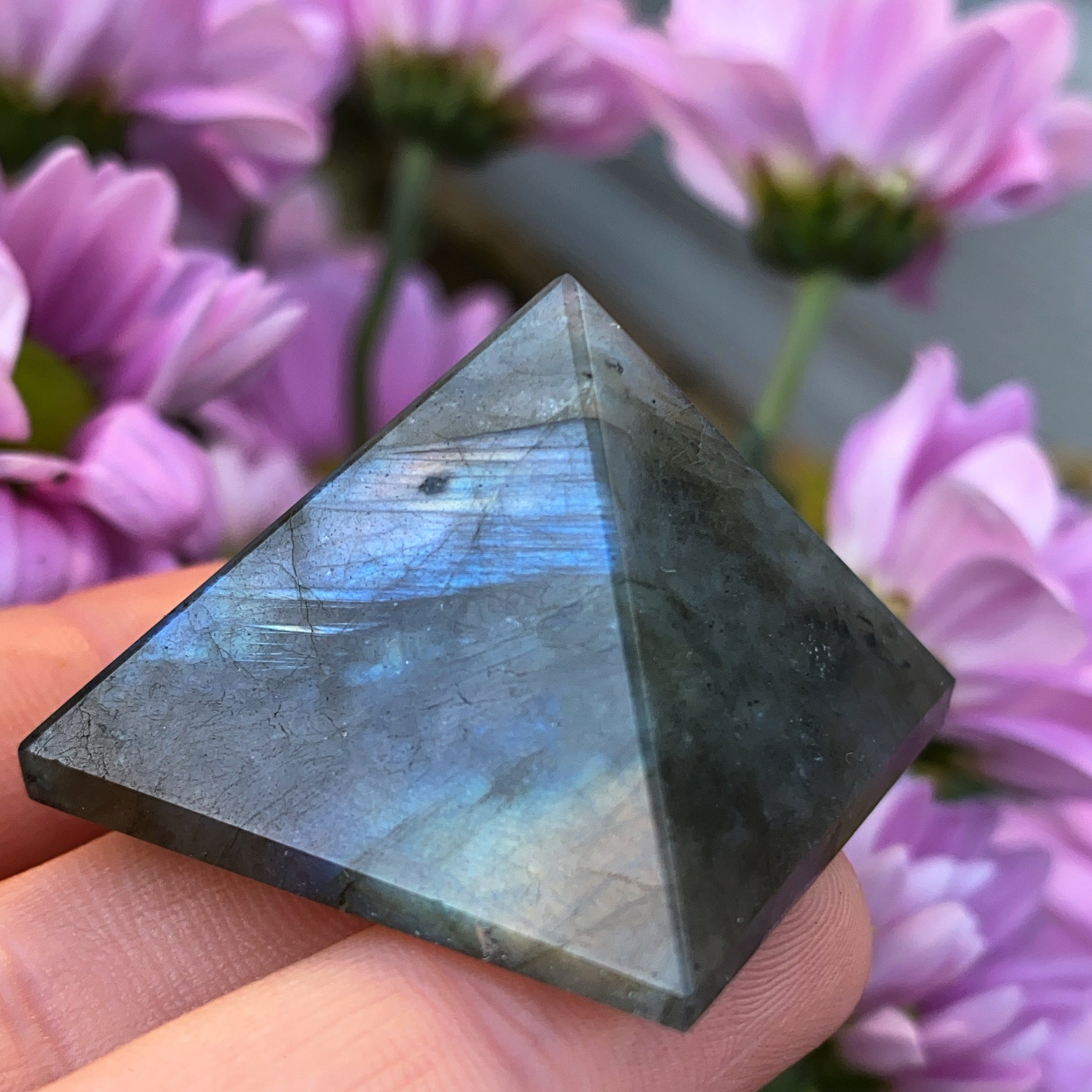 Stunning carved labradorite pyramid, a unique piece for your desk or display. A lovely gift for anyone who loves crystals and special things, this gift will last a lifetime and always hold memories.