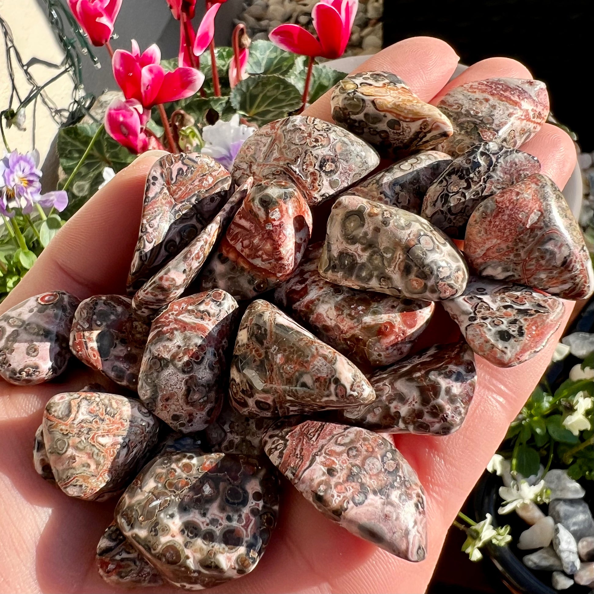 These Leopard Skin Jasper tumblestone crystals are bursting with high vibrational positive energy. The spiritual values of Leopard Skin Jasper relate to the unity we have with the natural world around us. It is considered a shamanic stone. It draws its beauty and strength from an animal and transmits its power to us when we carry it.