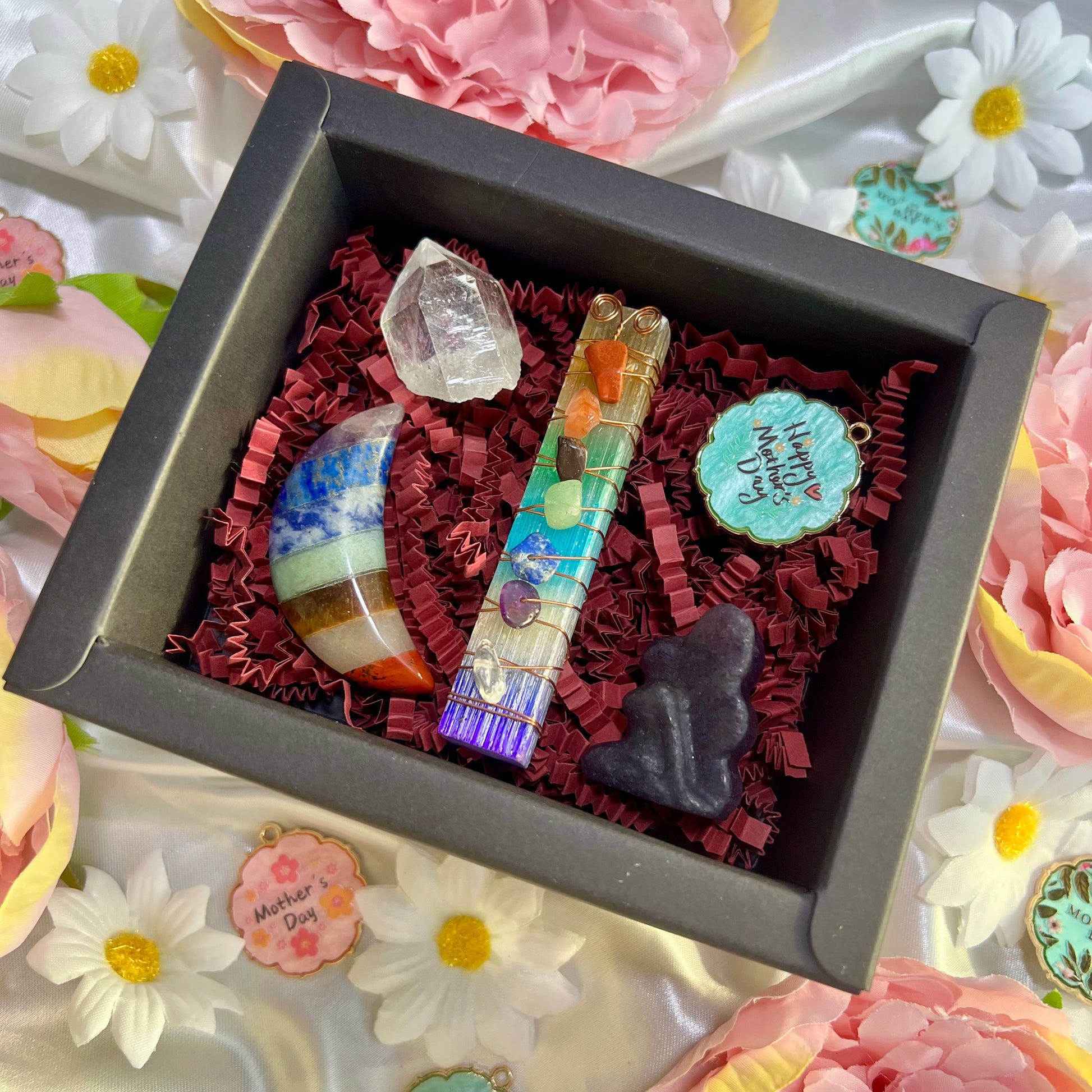 Support your mum's well-being with our 'Stay Magical' crystal gift box. If she's feeling fatigued, tense, or overwhelmed, this box will recharge her and restore her magic! Featuring our beloved Chakra Moon for alignment, our lepidolite fairy for stress relief and better sleep, and a Chakra wand for emotional balance. This is not just a typical Mother's Day gift, it's so much more!