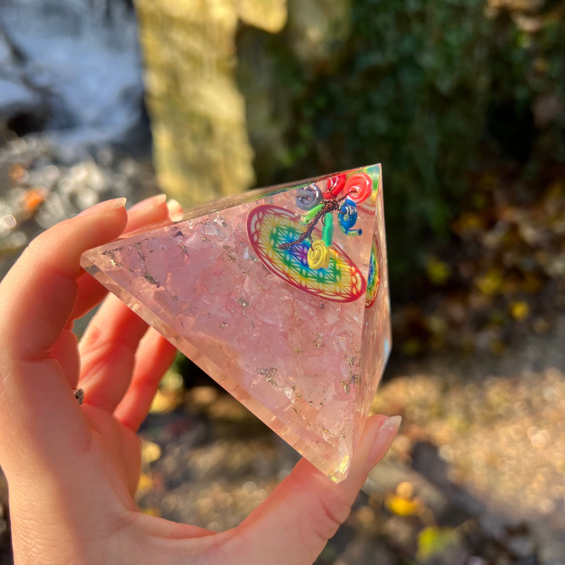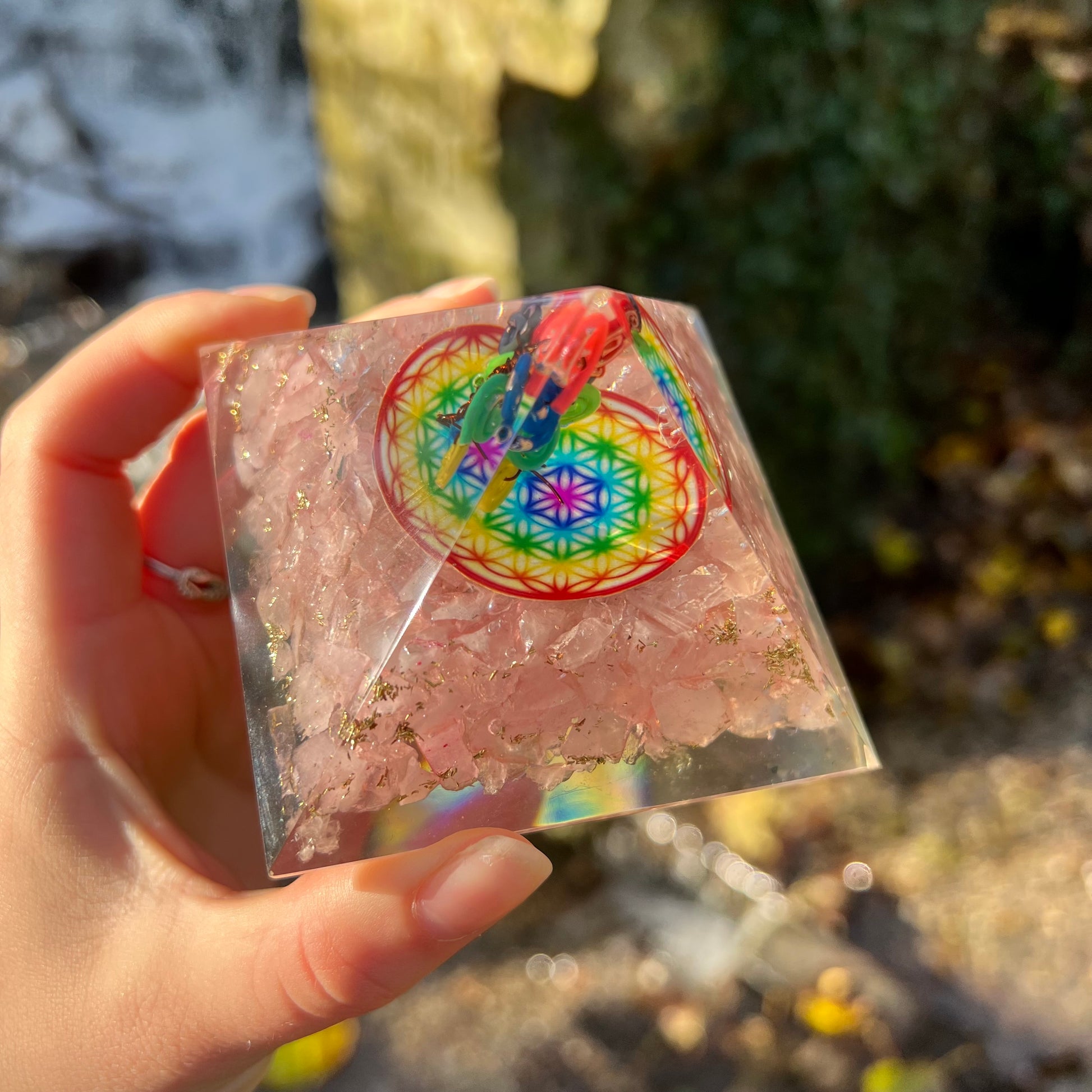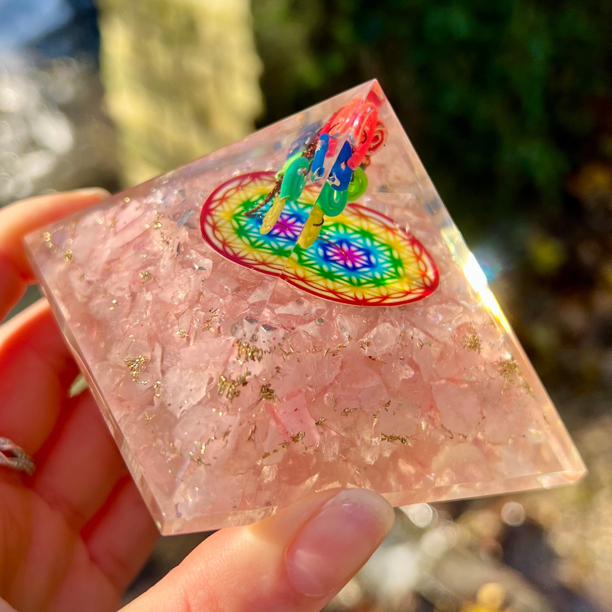 Orgonite Pyramid - Rose Quartz Rainbow Flower of Life