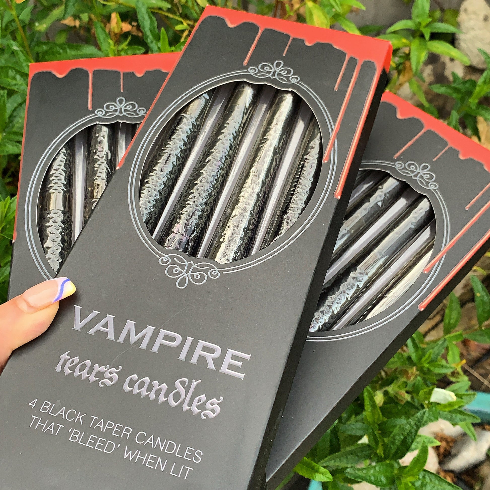 Pack of 4 Vampire Tears candles with an approximate burn time of 4 hours per candle. Once these black candles are lit and the wax begins to melt it turns red giving them their name 'Vampire Candles'. Made from paraffin wax.