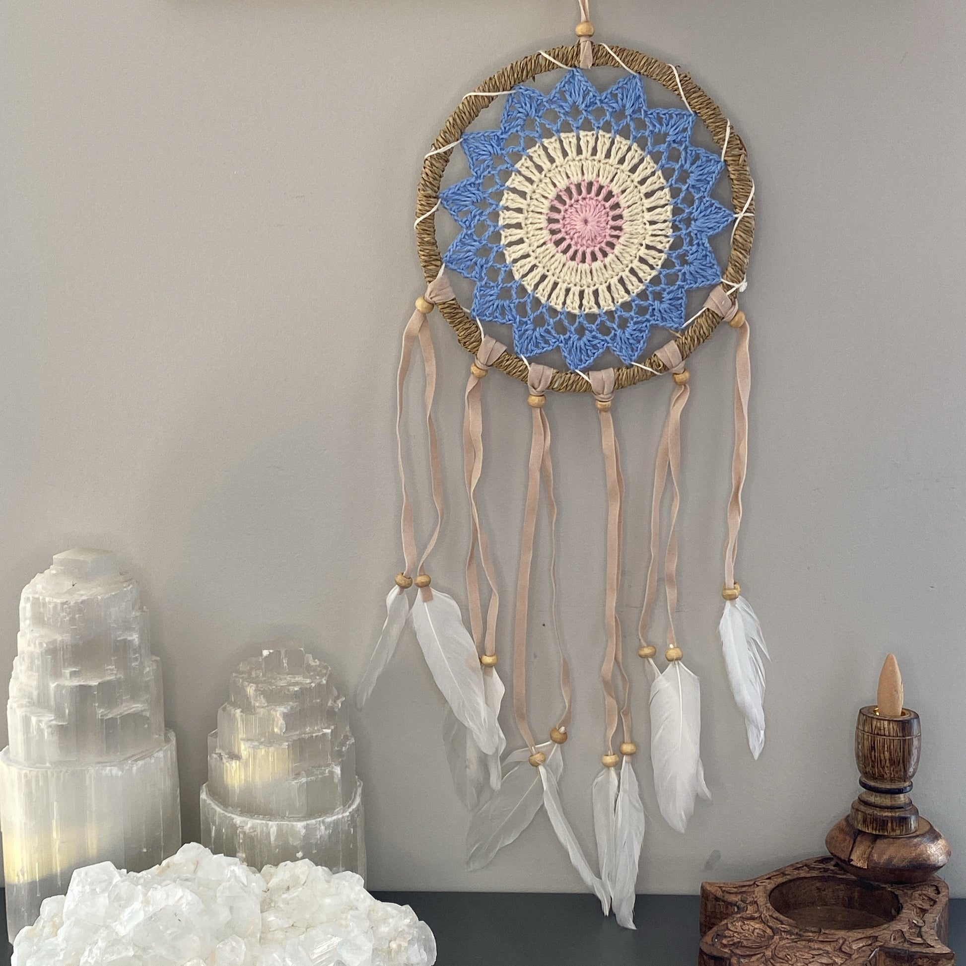 Native Americans believe that the night brings good and bad dreams. The dreamcatcher when hung near your bed catches the dreams. The good pass through and the bad not knowing the way get tangled in the dreamcatcher and perish with the first light of dawn. Sweet Dreams!