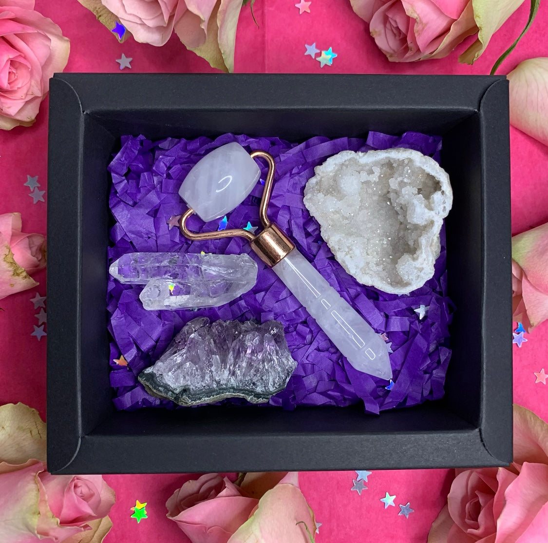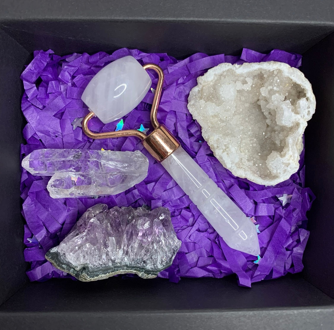 This Crystal Gift Set is the perfect way to show you care. This one of a kind Crystal Gift Set includes an energizing gemstone face roller, and mixture of Calming energy powered raw crystals. Each crystal is perfectly paired to create the ultimate self-care experience, so the person you care about can feel calm & relaxed no matter where they go. Each item is designed to nurture and support self care, relaxation, and well-being. Ready to make someone feel special? Shop this Crystal Gift Set today!