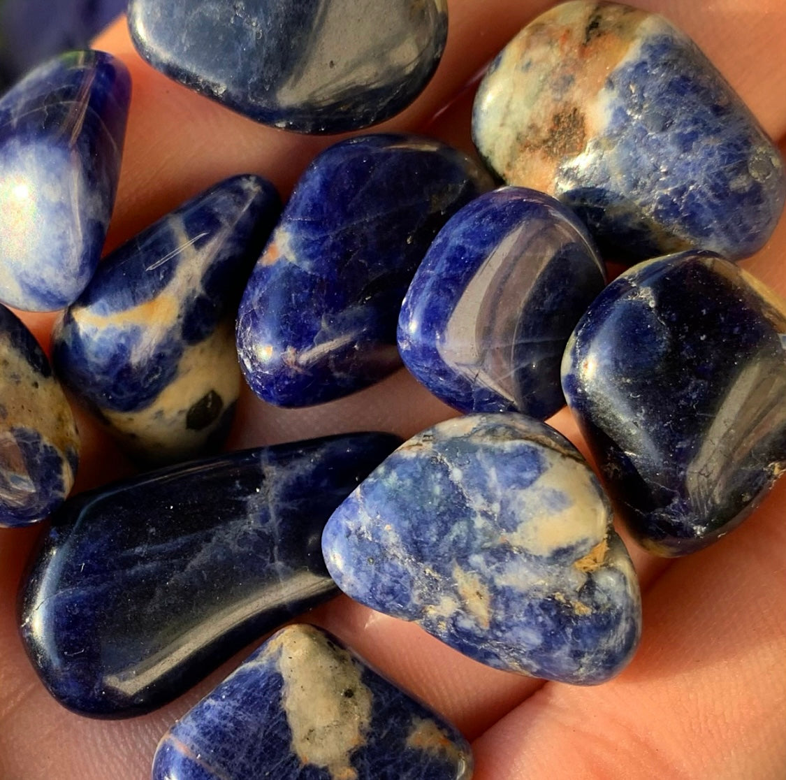 Stunning Sodalite Tumblestones, each one has unique markings and colours of stunning blues & whites. Place one of these stones on your desk or keep around you to benefit from the Sodalite Crystal Healing Properties. A a lovely gift for someone who needs emotional balance, a perfect healing stone for boosting self-esteem & creating calmness against anxiety.