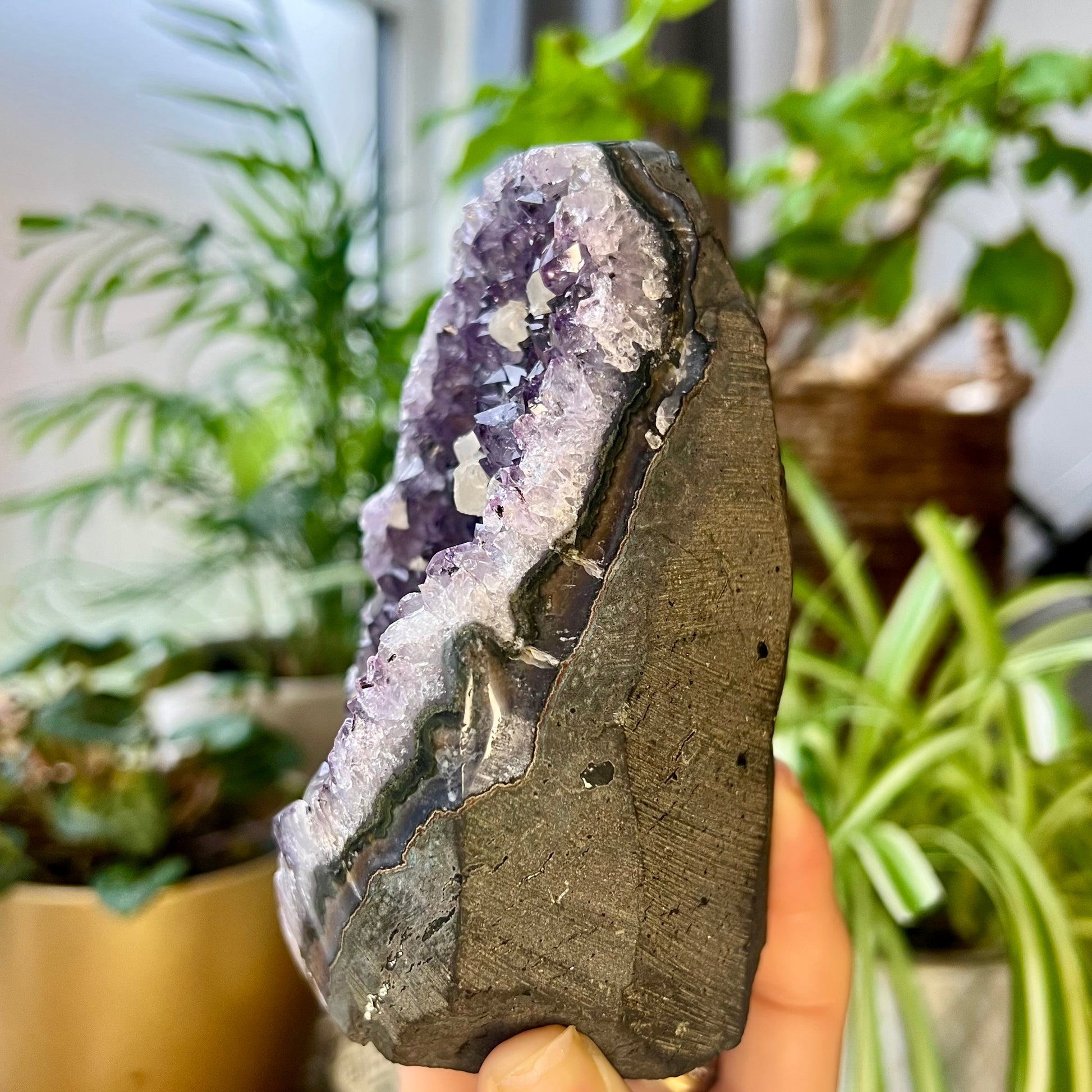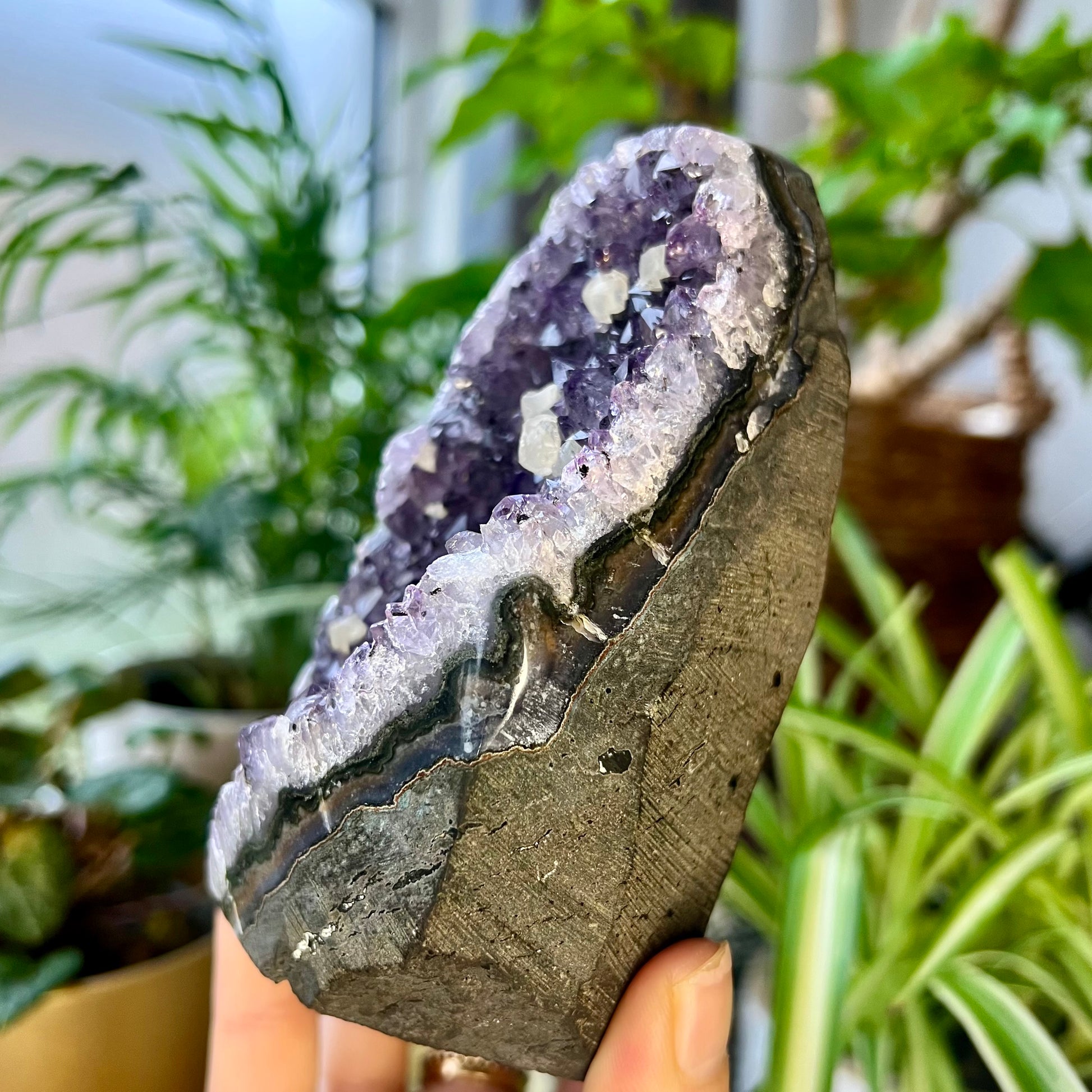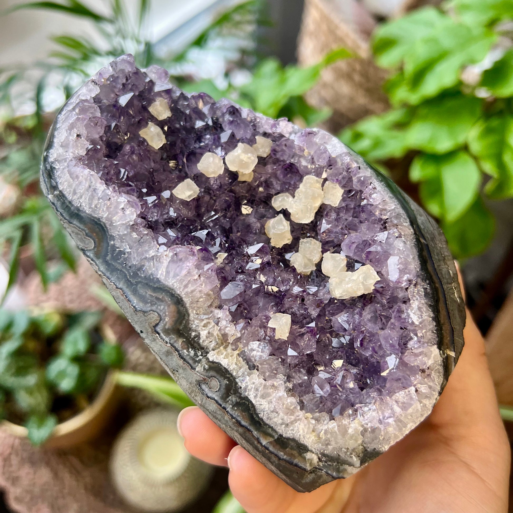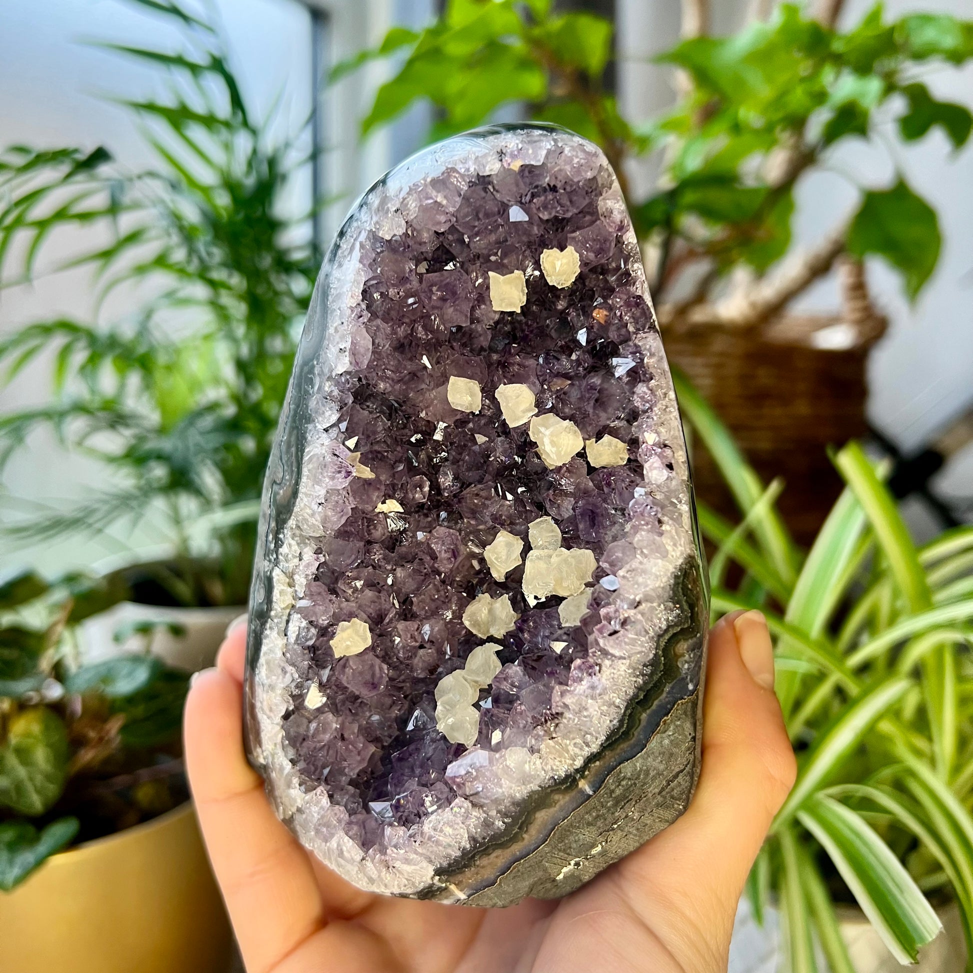 Enhance your crystal collection with this Uruguayan Amethyst Cluster. Weighing 660g, it features rare calcite cube formations, adding unique character to the cluster. Enjoy the calming energy of amethyst and the amplifying properties of calcite. A must-have for any crystal enthusiast.